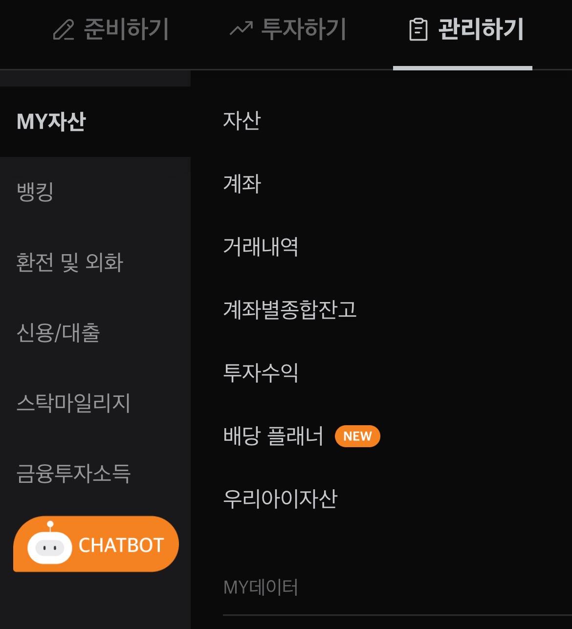 미래에셋증권 앱에 들어가 메뉴 >> 우측상단 관리하기를 누르면 my 자산 탭에 배당플래너라는 게 new라고 표시되어 있습니다.
