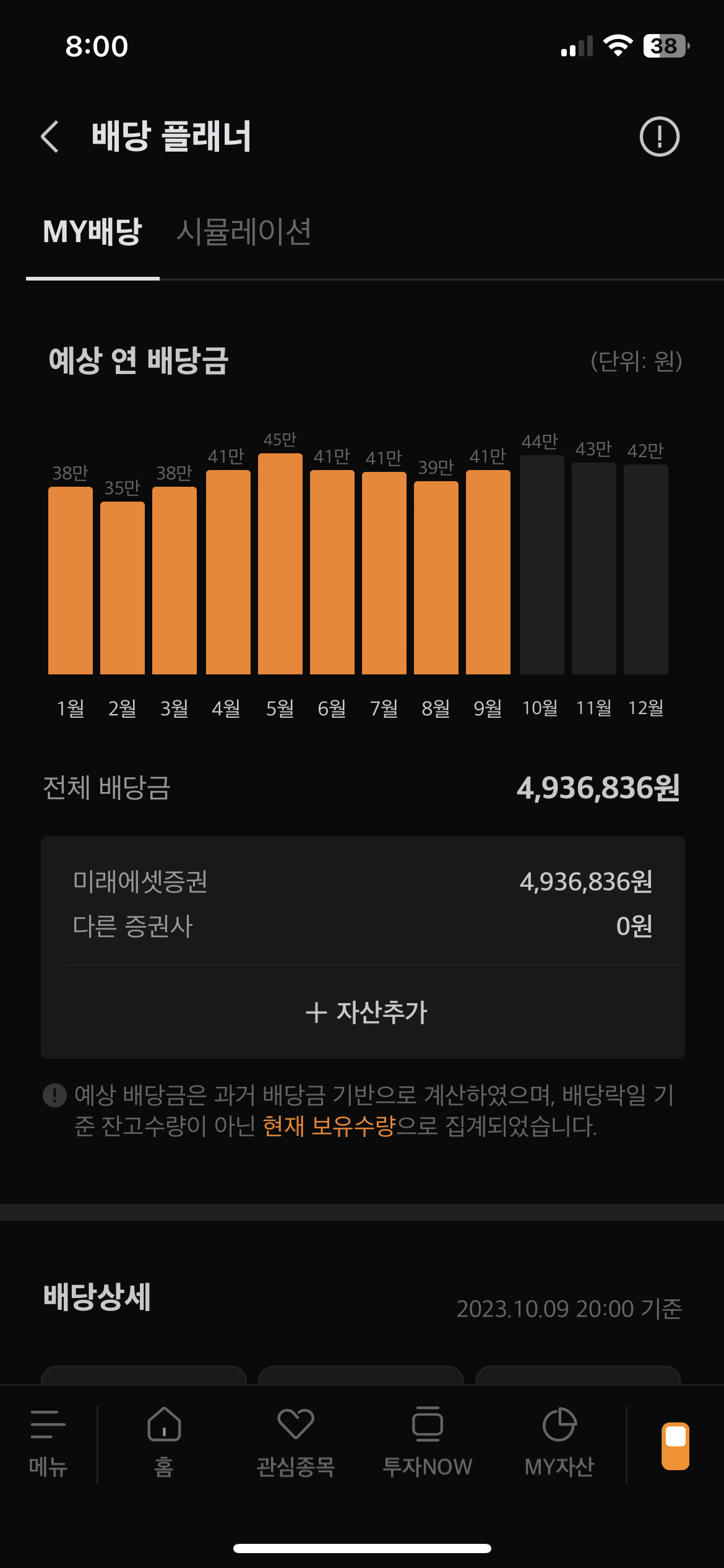 예상되는 배당금은 과거 배당금을 기반으로 계산된다고 적혀있고, 배당락일 기준이 아닌 현재 보유수량으로 집계가 된다고 합니다.