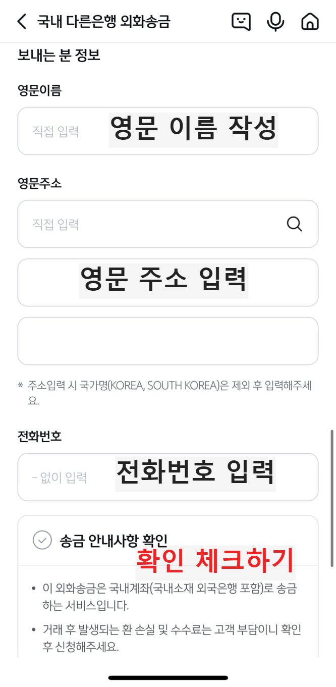 영문이름 작성 > 영문주소 (우리 집 영문주소 변환기 click) > 송금 예정일 (당일로 선택)
