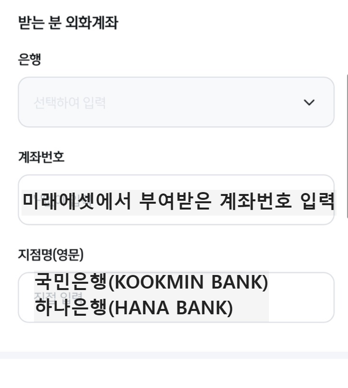 은행 선택 미래에셋에서 외화연계계좌 등록한 은행 (하나은행 or 국민은행 ) 선택 후 계좌번호를 입력해 주세요.