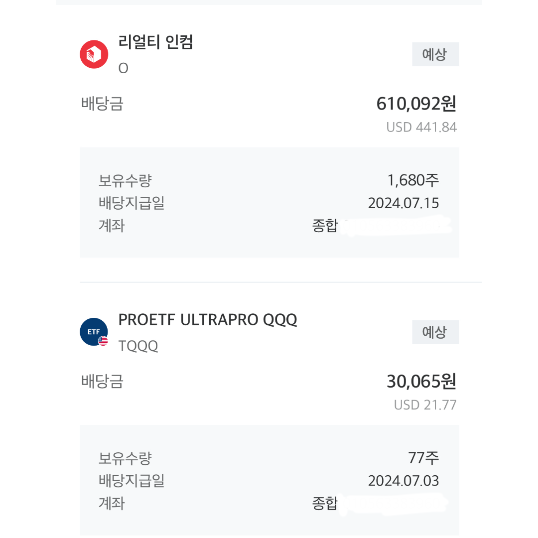 이번달에 들어올 리얼티인컴 배당금 61만 원, TQQQ 3만 원, 달러 rp 40만 원 까지 하면 배당으로 500만 원을 돌파하는 달 입니다!