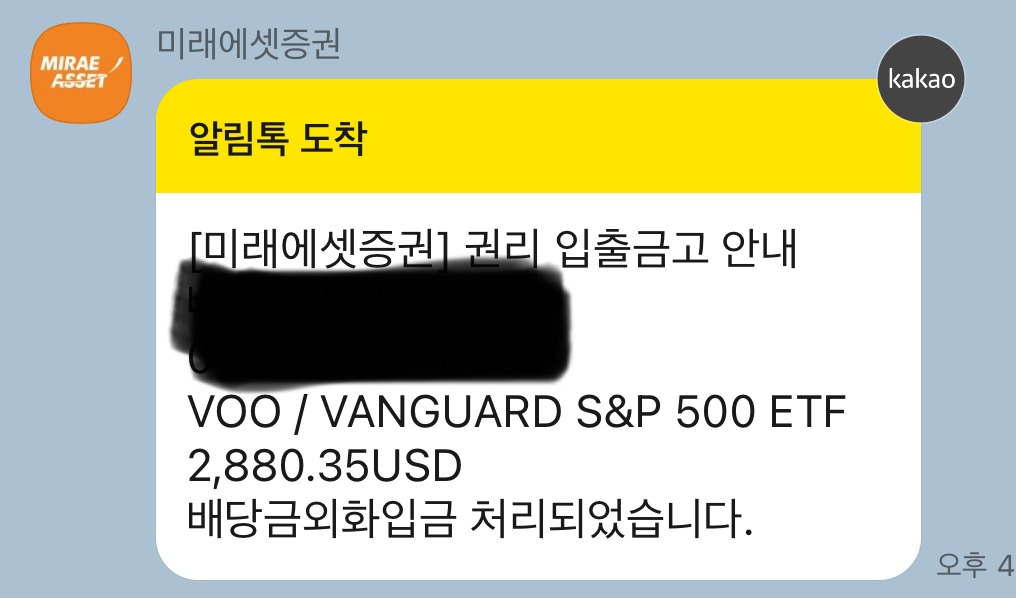 남편 미스터부의 배당금은 VOO 1,900주 기준으로 세전 4,679,047원이며 세후 총 2,880 USD 입금되었습니다.