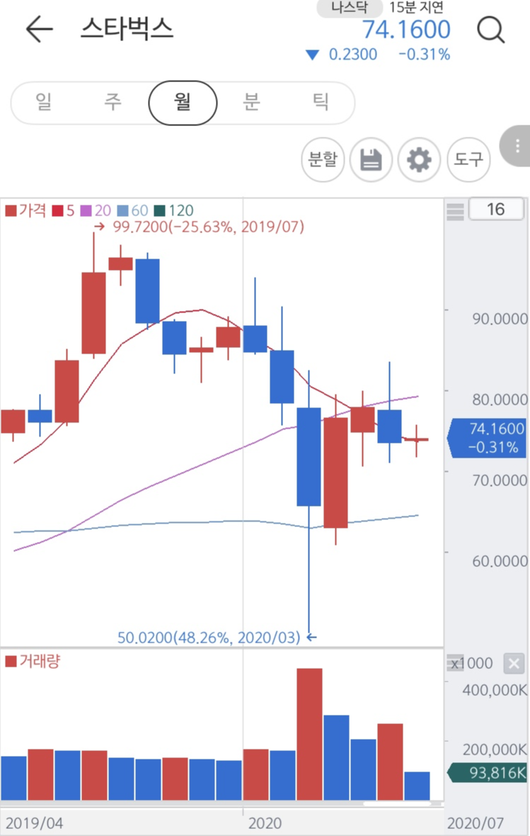 저는 스타벅스가 코로나로 인해 저점까지 떨어졌을 당시부터 매수를 시작해서 보유하고 있었는데, 스타벅스가 오르락 내리락을 하며 서서히 원래의 주가로 회복하는 과정에서 가격부담으로 인해 꾸준히 매수하던 것이 점차 어려워졌답니다.