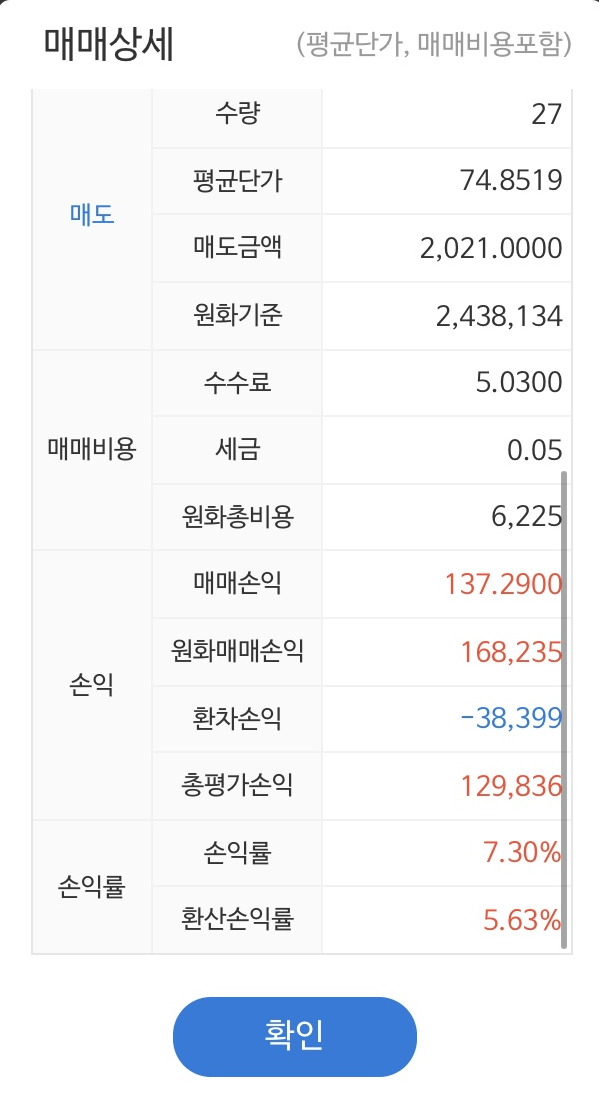 (원화 매매손익-환차손익)을 뺀 값으로 총 129,836원 손익을 보고 매도했습니다.
