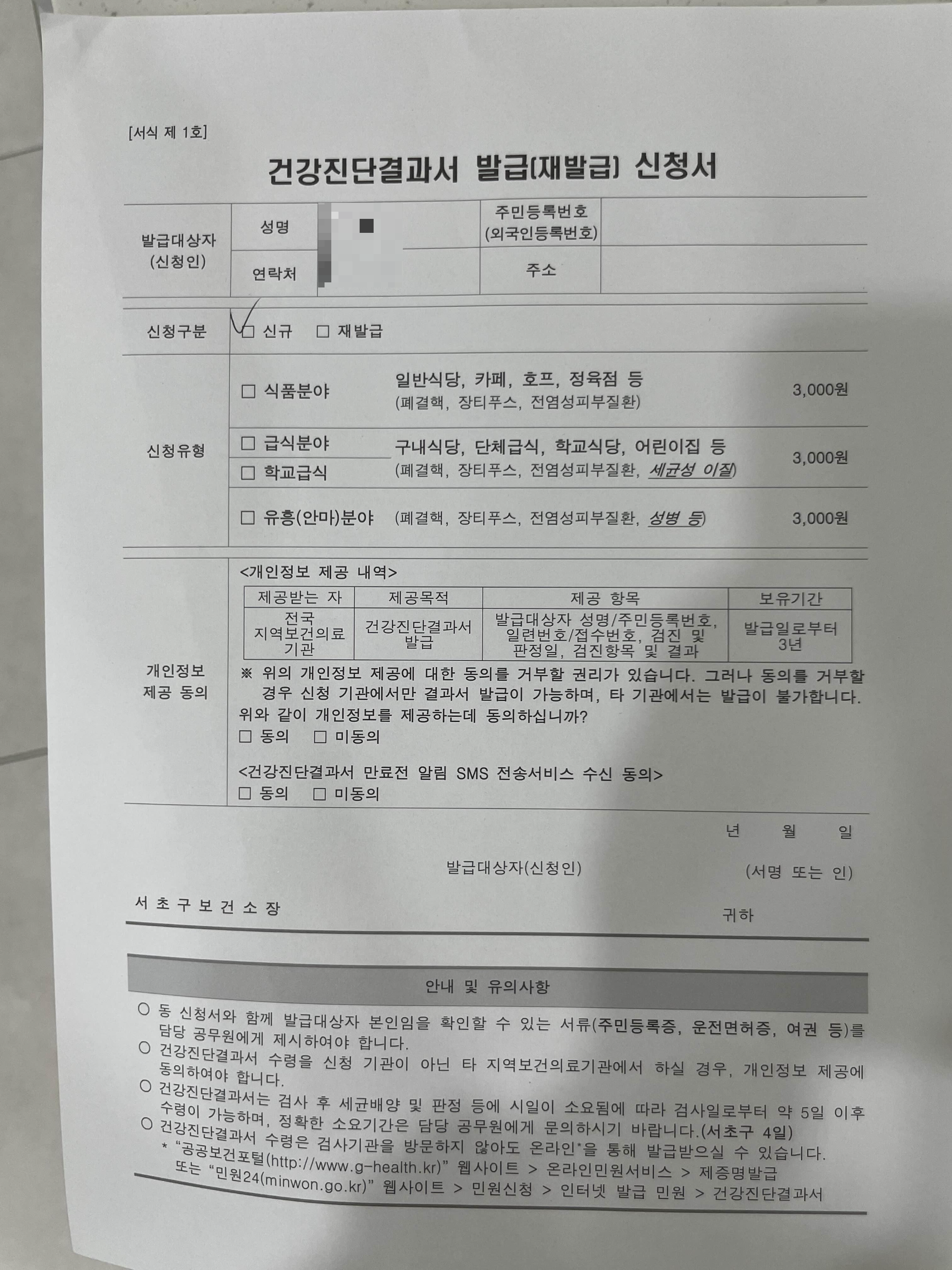 간단한 보건증 신청 서류를 접수대에서 접수하고 3,000원을 결제합니다.
